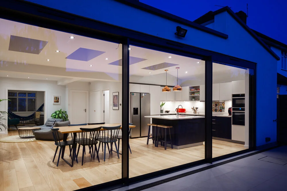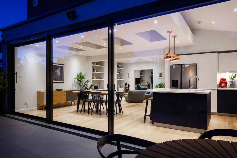 In contrast, the rear extension embraces a bold, ultra-modern aesthetic. A flat roof runs along the rear elevation, seamlessly connecting with the pitched roof to the side. A high-level slit window along the roof junction draws natural light deep into the kitchen, while a series of evenly spaced rooflights and a full-width set of grand sliding doors flood the space with daylight.
