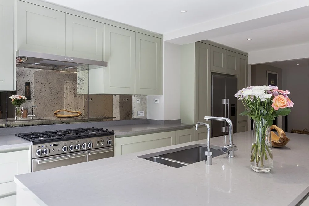 To the rear, a large open-plan kitchen, dining, and living area was created, opening out onto a walled courtyard garden. Full-width glazed bifold doors flood the space with natural light and offer uninterrupted views of the garden beyond. The interior design was tailored to reflect the clients’ personal style incorporating cherished pieces like their antique dining table, which now sits harmoniously within the new space. The living area was designed to feel distinct from the kitchen, offering a comfortable and quiet setting with a strong connection to the outdoors.