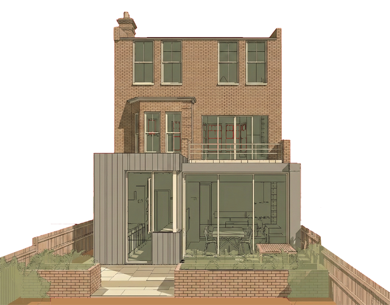 Rear view of the modern extension to a ground-floor flat in an Edwardian terrace house in Muswell Hill, blending contemporary design with period architecture.