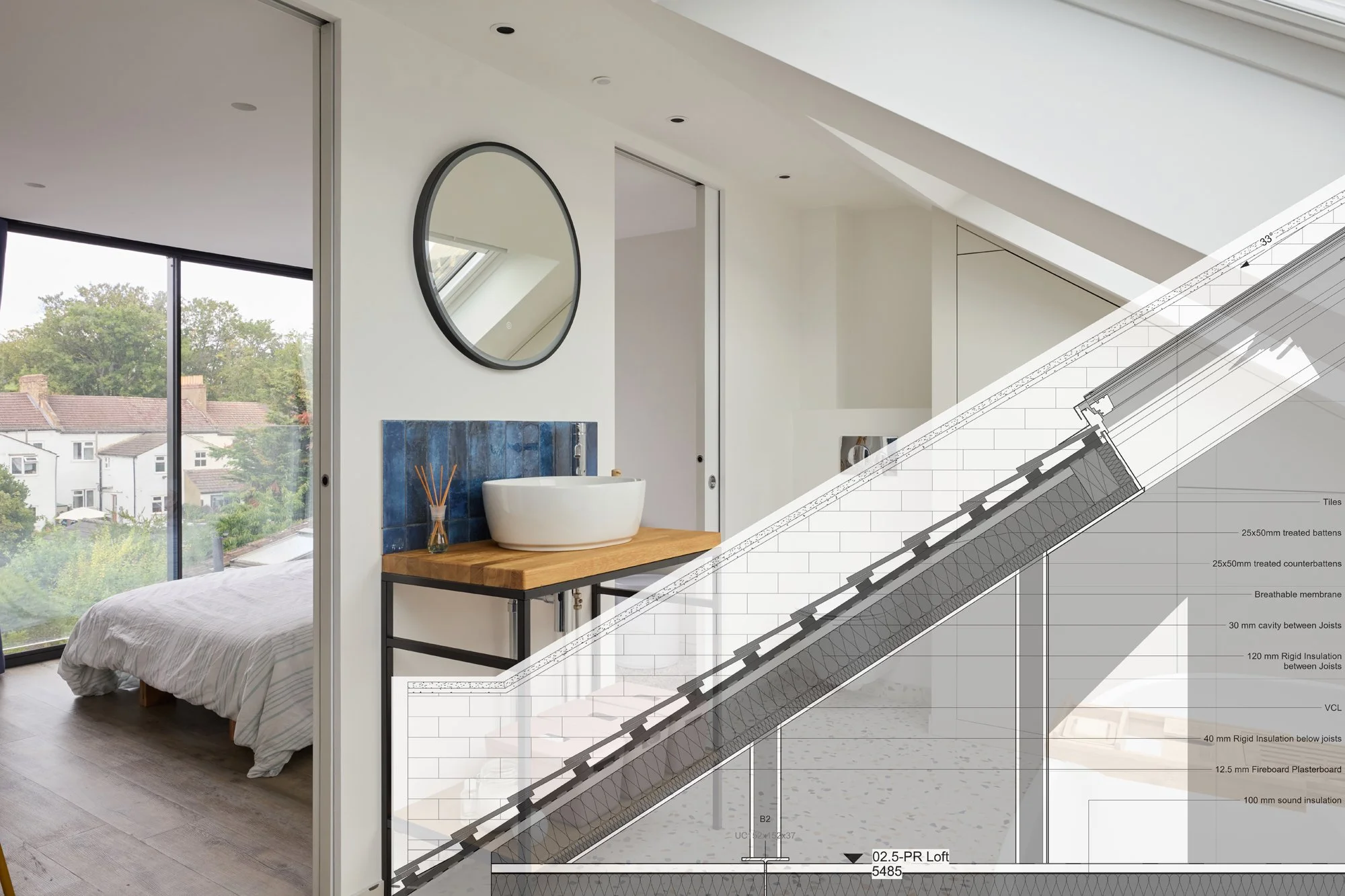 A detailed drawing set for a semi-detached property featuring a rear extension and loft conversion, illustrating how our designs support planning, building control, and on-site construction.