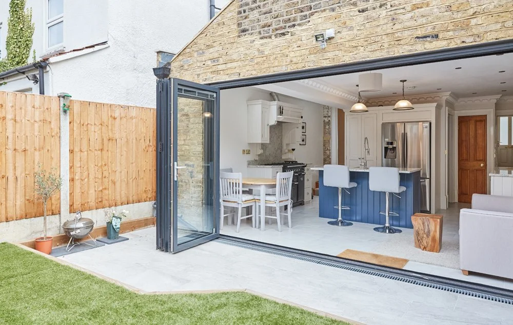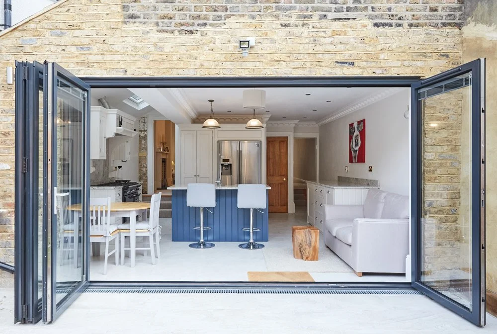 On the ground floor, the existing living and dining rooms were opened up to form a generous, formal lounge — ideal for relaxing and entertaining. To the rear, the side-return extension created a bright, open-plan kitchen, dining, and seating area. The kitchen features sleek white units complemented by a bold blue island, which includes a sink and breakfast seating for two.