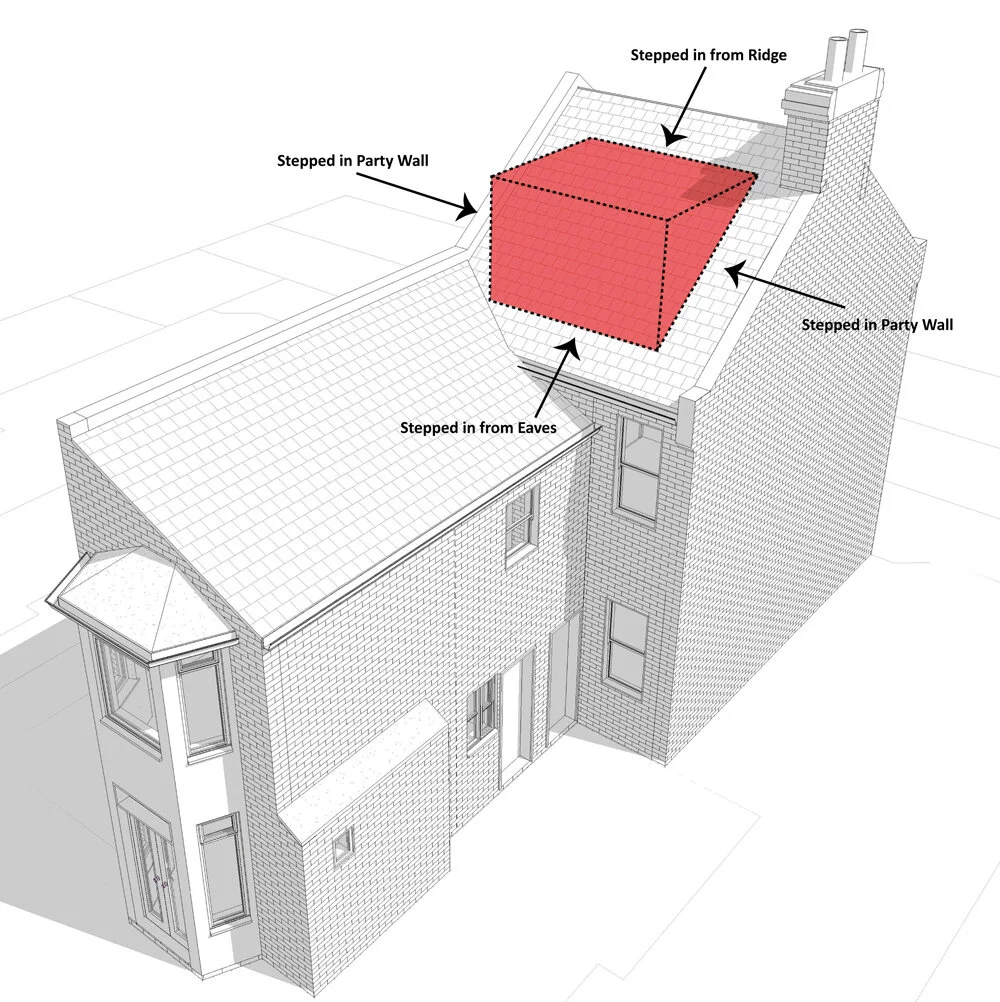 Any proposed dormers should be stepped in by 200mm from the existing eaves line.