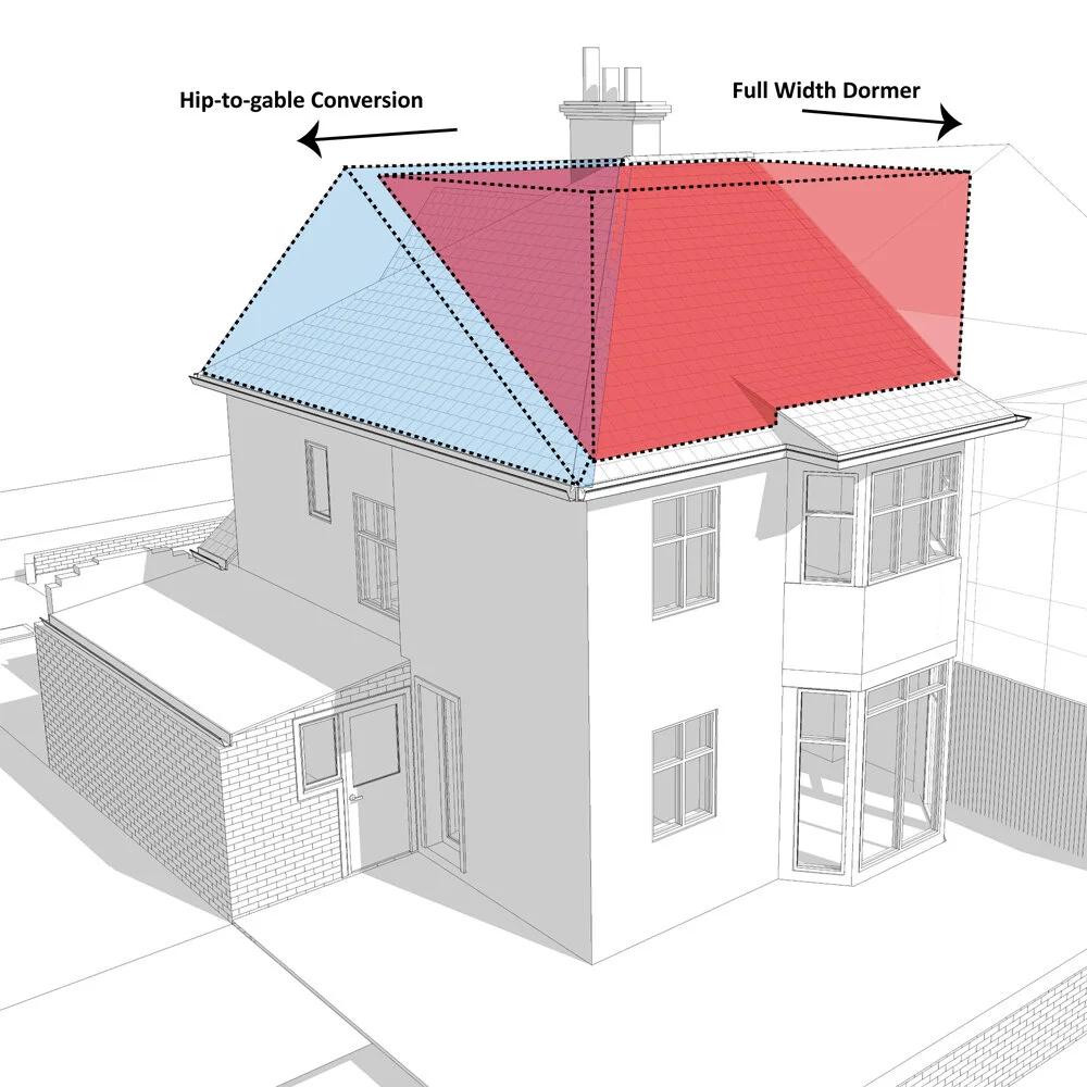 It is important to note that it is only the volume added and this is taken from the external dimensions only. Please see below an example of volume added to a 1930’s semi-detached property in the form of a hip-to-gable and full width rear dormer.