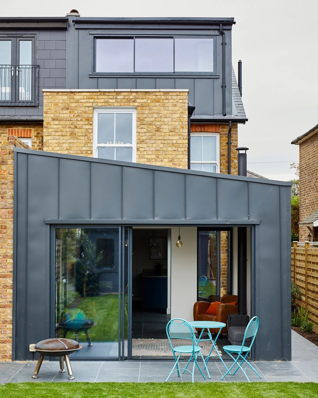An alternative approach is to create a contrast between the new dormer and the existing house. For example, a project completed by Model Projects in South-West London involved a hip-to-gable extension and a full-width rear dormer clad in anthracite grey metal standing seam panels. The contemporary finish offered a striking contrast against the rustic tones of the original London stock brick.