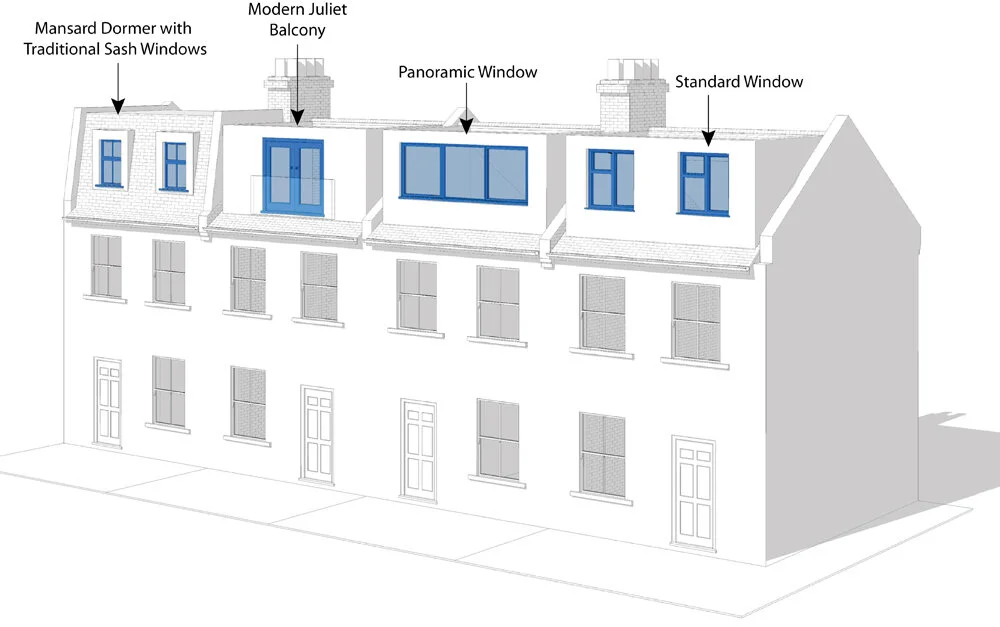 One popular route is to match the style and period of the existing property. A good example is a traditional mansard roof on a Victorian home. In this case, the flank (party) walls are typically built up using London stock brick, while the rear dormer is finished with slate tile cladding and fitted with traditional sash windows helping the extension blend seamlessly with the original architecture.