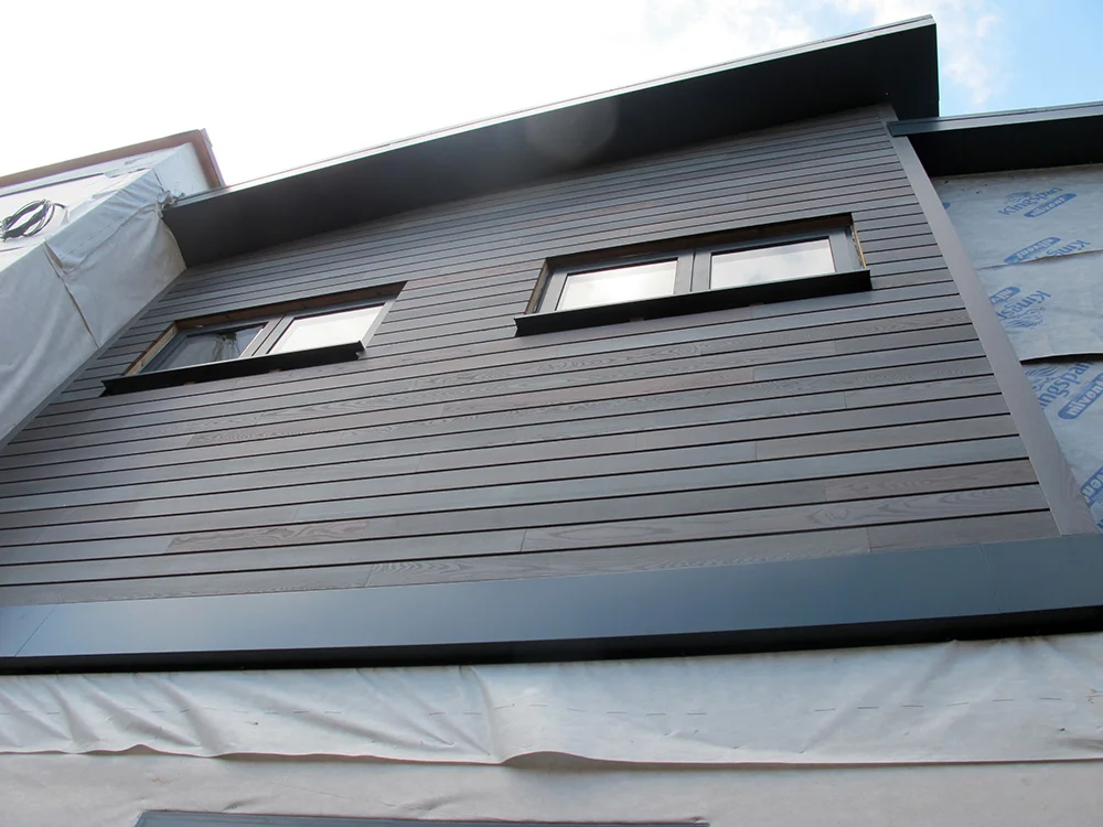 Externally, the house presents a crisp and modern palette. White render and thermowood cladding are contrasted with grey brick surrounds and structural pillars, creating depth and texture. Dark grey aluminium windows tie in with the metal roof and architectural trim, reinforcing the contemporary design. To the rear of the plot, a single-storey garage is discreetly tucked beneath the cantilevered master bedroom, adding a functional yet visually dynamic element to the overall composition.