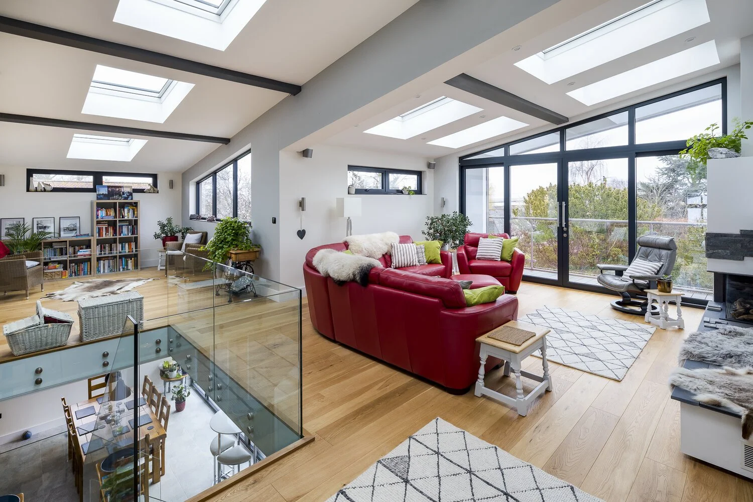 A distinctive feature of the home is the placement of its living spaces across both the ground and first floors, connected by a striking central staircase. The first-floor living room is a true highlight designed with a vaulted ceiling and a series of rooflights that flood the space with natural light. Large sliding doors open onto a generous first-floor terrace, offering elevated views and a seamless indoor-outdoor connection.