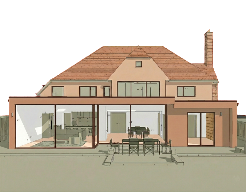 To manage the scale and reduce the perceived bulk of the extension, the rear elevation has been designed with a staggered, cubist form. This thoughtful articulation introduces visual interest and helps to break down the massing. Timber cladding and overhanging elements soften the architecture, adding warmth and texture while enhancing the overall composition.
