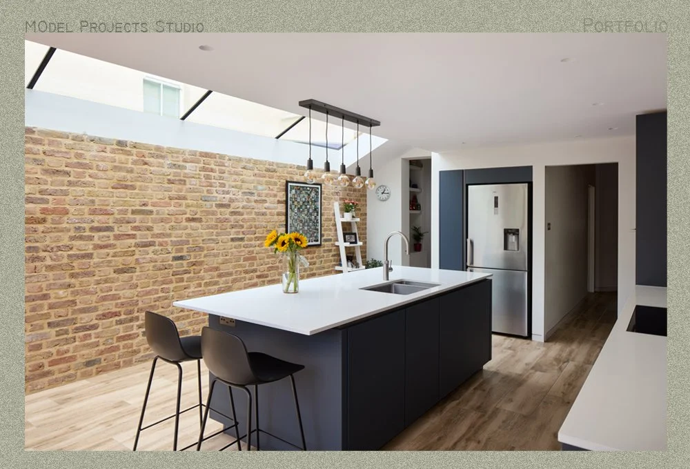 To achieve this, the design team at Model Projects created a striking wrap-around single-storey extension with a staggered rear. Full-height glazing flows around the extension and up to the apex of the sloped roof, complemented by a full-length glazed roof along the side return to flood the interior with daylight.