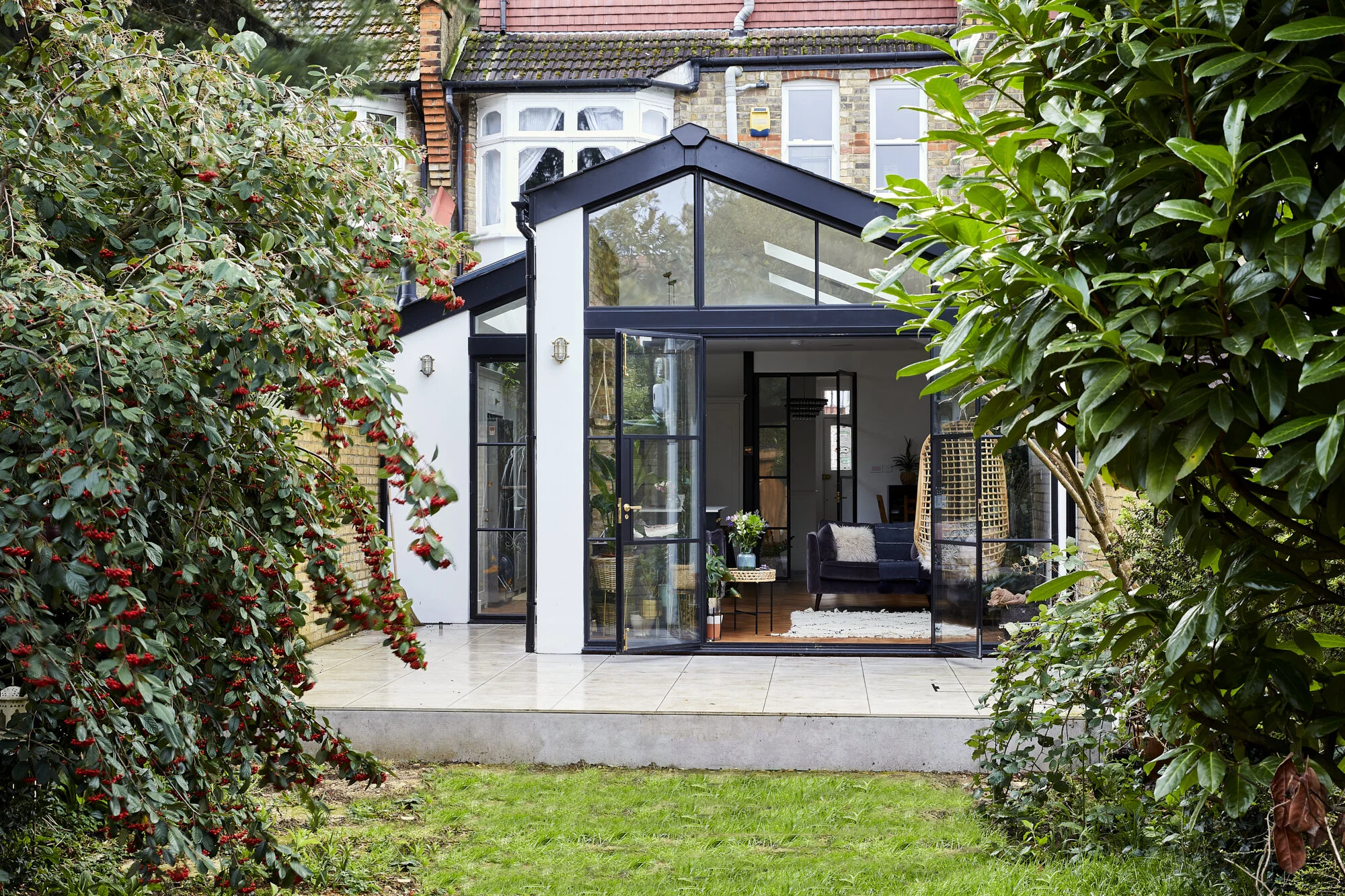 The industrial Crittall doors, a key feature for the family, are carried through the design, linking spaces from the front of the house all the way to the open rear extension.