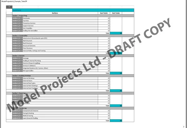 - Confirm Take-off (excel spreadsheet detailing build cost) and the quantities needed and review against the approved drawings, including area and volume.