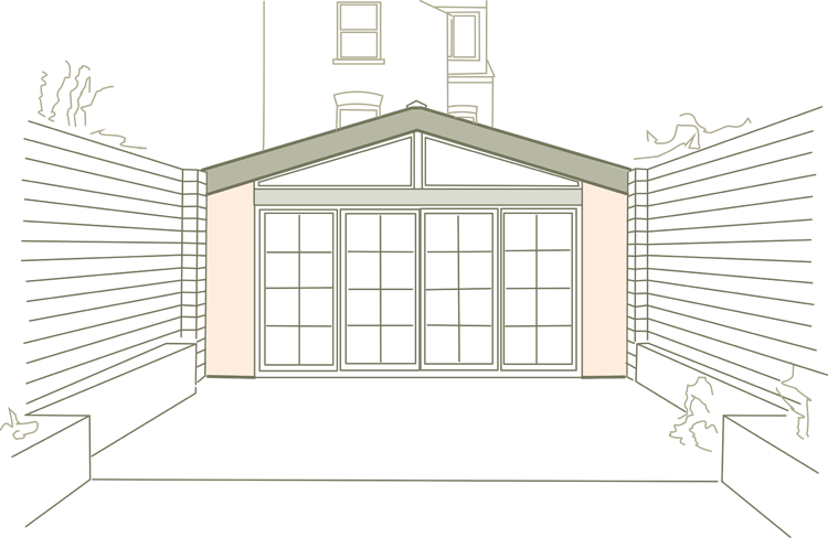 The extension design for Sarah and Sebastian's home focuses on symmetry and functionality. A pitched roof, rear glazing, and balanced rooflights provide a seamless flow from the interior to the courtyard garden at the back of the house. The rear glazing, featuring four industrial-style bi-fold doors with a split triangle window above, creates an attractive, modern aesthetic. This design element is carried through in the detailing around the windows and fascia, contributing to a cohesive industrial feel.
