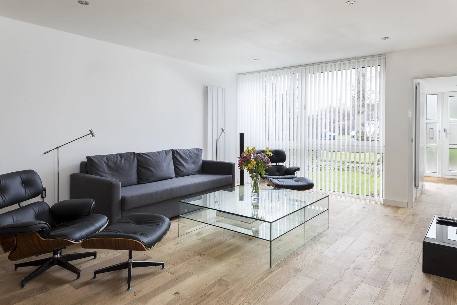 Internally, the extension created a spacious open-plan kitchen and dining area, with new sliding doors opening onto the garden. The original internal timber cladding was replaced with clean, white-plastered walls, and a continuous flooring finish was introduced to enhance the sense of flow throughout the ground floor.