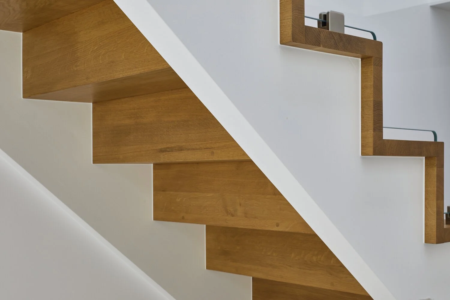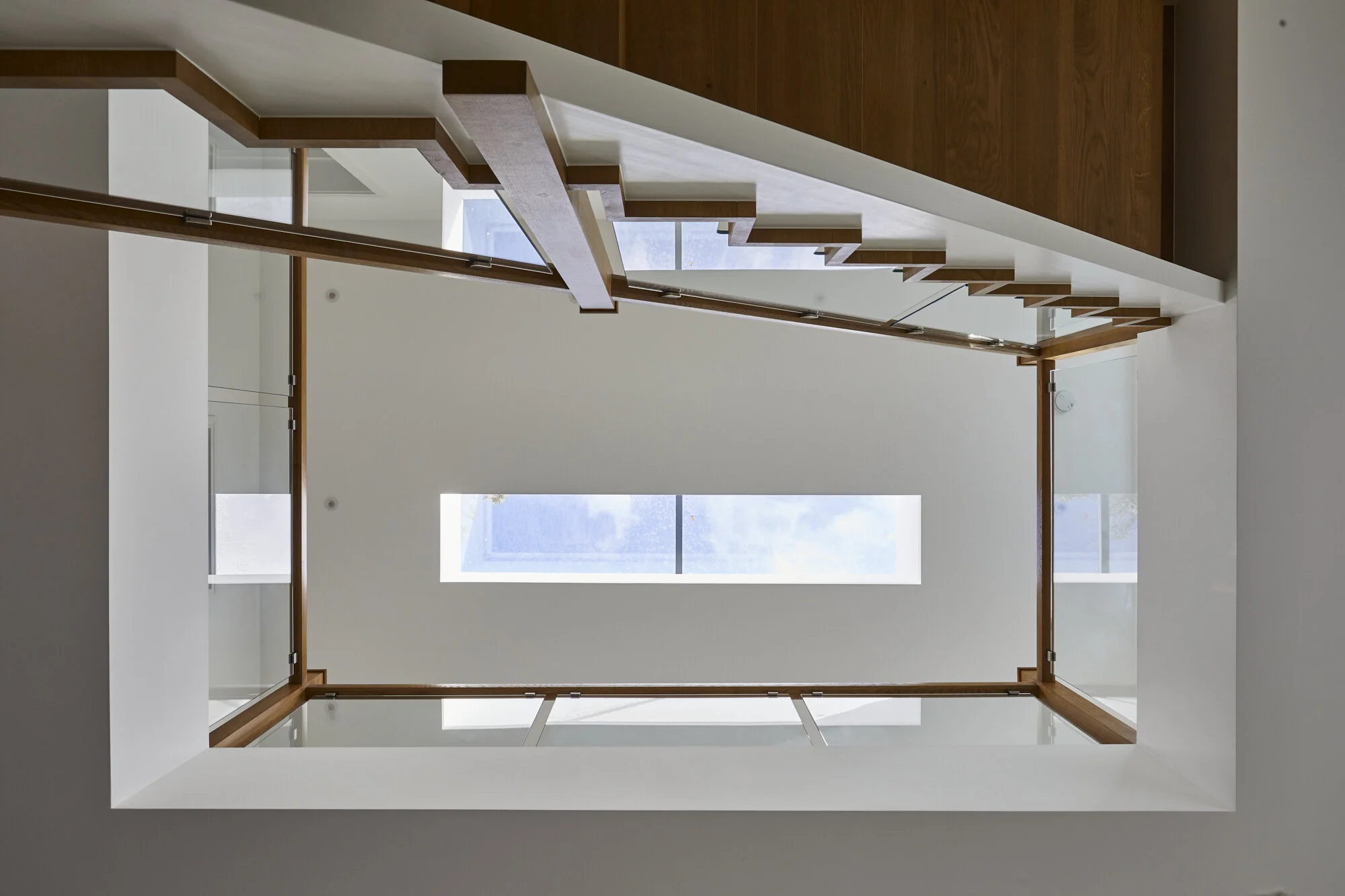 As you enter the house through an oversized front door, you're welcomed into a large, spacious hallway. From this central space, your eye is immediately drawn to the garden beyond, framed perfectly through a full-height fixed window. A striking straight-run staircase connects the three levels of the home, leading up to a first-floor gallery and down to the basement level. The space feels transparent and light-filled, with daylight pouring in from an elongated rooflight that mirrors the staircase's line below, enhancing the sense of openness.
