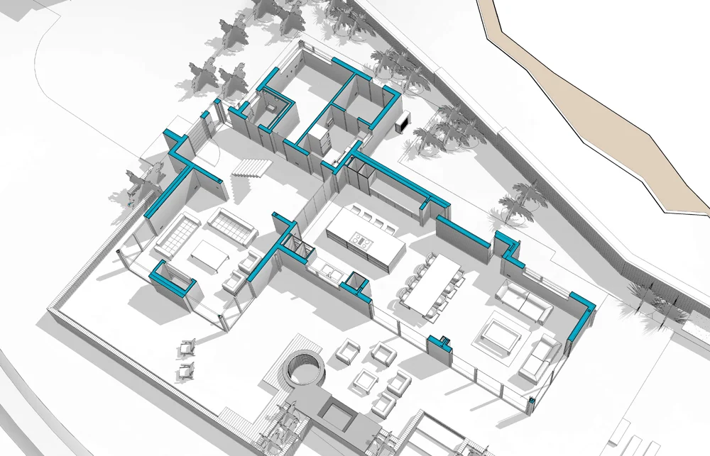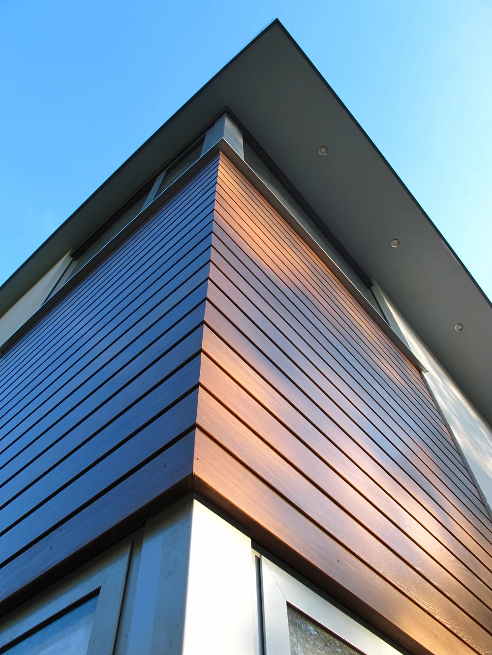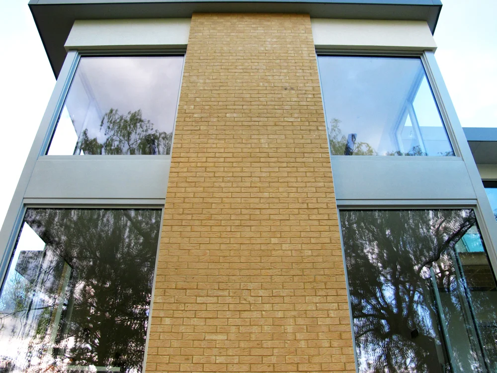 The external material palette balances simplicity with texture light render contrasts elegantly with thermally treated timber cladding and textured brickwork. These materials are thoughtfully continued into the landscaping, creating a seamless connection between the house and its garden terraces.