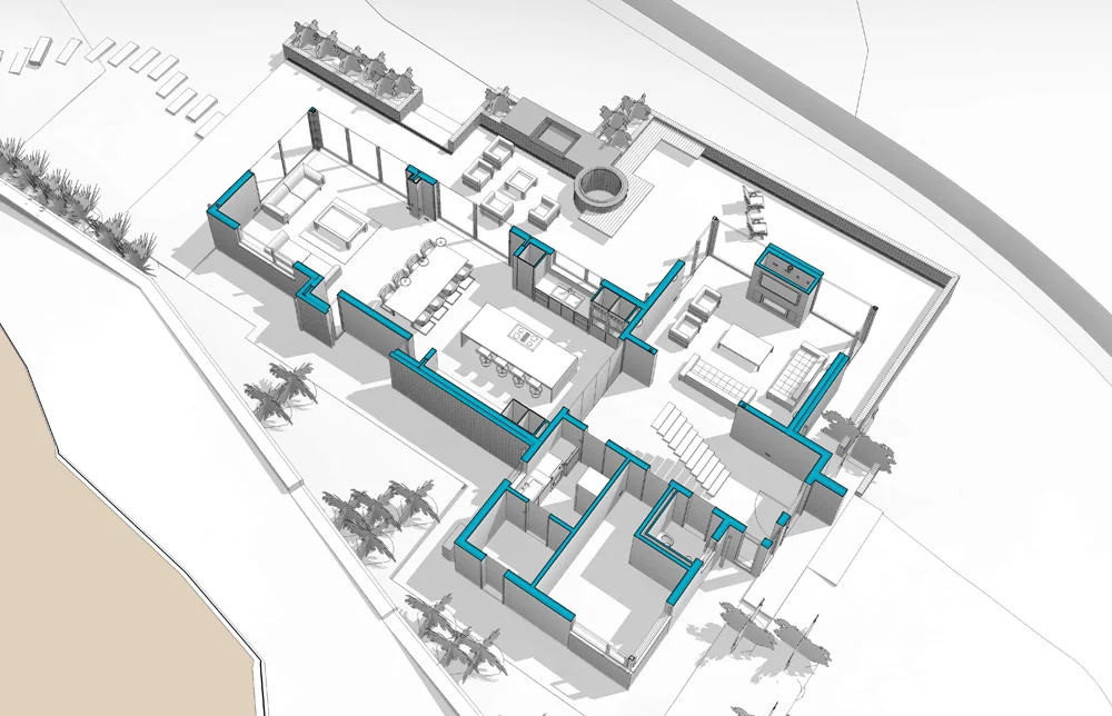 As you move around the property, a rich blend of contemporary forms and varied materials becomes evident. The design features striking corner windows, expansive glazing, and cantilevered terraces, all carefully positioned to immerse the interior spaces in natural light and capture the beauty of the surrounding tree-lined countryside.